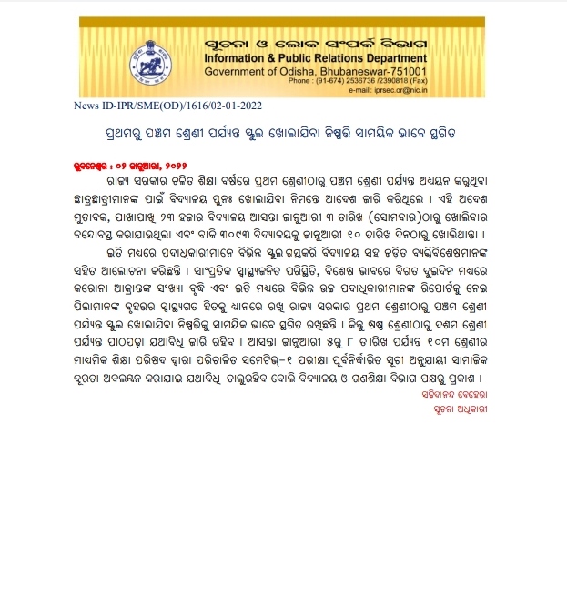 ରାଜ୍ୟରେ କାଲି ଠାରୁ ଅର୍ଥାତ ଜାନୁଆରୀ ୩ ତାରିଖରୁ ପ୍ରଥମରୁ ପଞ୍ଚମ ଶ୍ରେଣୀ ପର୍ଯ୍ୟନ୍ତ ଥିବା ସ୍କୁଲ ଖୋଲିବାକୁ ନିଷ୍ପତ୍ତି ନେଇଥିଲା ରାଜ୍ୟ ସରକାର । କିନ୍ତୁ ଏବେକାର କରୋନା ସଂକ୍ରମଣ ବଢ଼ିବା ଓ ଓମିକ୍ରନ୍କୁ ଦୃଷ୍ଟିରେ ରଖି ନିଷ୍ପତ୍ତି ବଦଳାଇଛି ବିଭାଗ । ତେଣୁ ଆସନ୍ତାକାଲି ଠାରୁ ଖୋଲିବାକୁ ଥିବା ପ୍ରାଥମିକ ଶ୍ରେଣୀର ନିଷ୍ପତ୍ତି ଉପରେ ରୋକ ଲାଗିଛି । ପ୍ରଥମରୁ ପଞ୍ଚମ ଶ୍ରେଣୀ ସ୍କୁଲ ଖୋଲିବା ଉପରେ ସାମୟିକ ଭାବେ ସ୍ଥଗିତ ରଖାଯାଇଛି । ବିଦ୍ୟାଳୟ ଓ ଗଣଶିକ୍ଷା ମନ୍ତ୍ରୀ ସମୀର ଦାଶ ଏନେଇ ସୂଚନା ଦେଇଛନ୍ତି ।